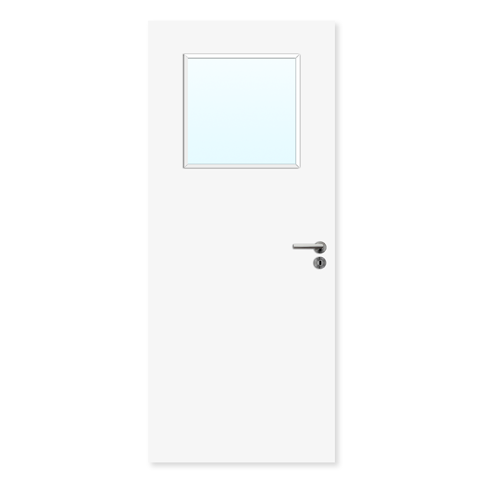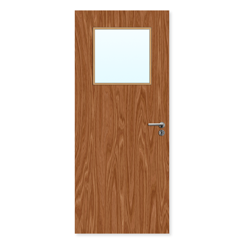 This single 30 minute fire door is glazed with a 450mm x 450mm glass panel.