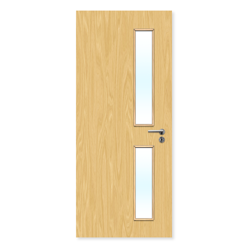This single 30 minute fire door is glazed with 150mm x 775mm (top) and 150mm x 700mm (bottom) glass panels.