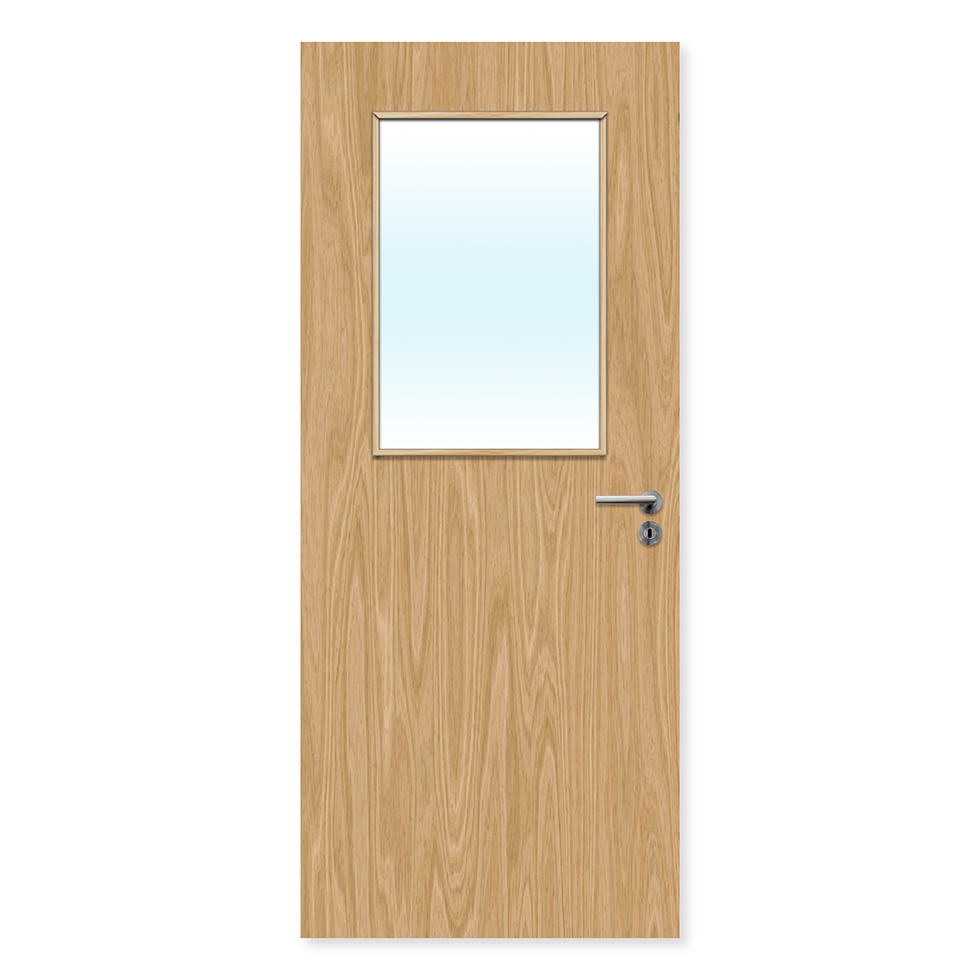 This single 30 minute fire door is glazed with a 450mm x 700mm glass panel.