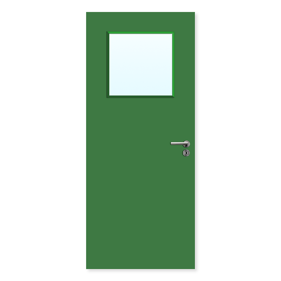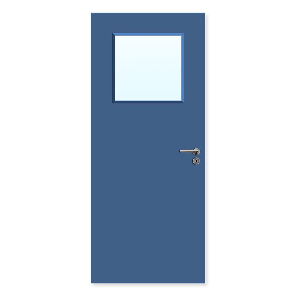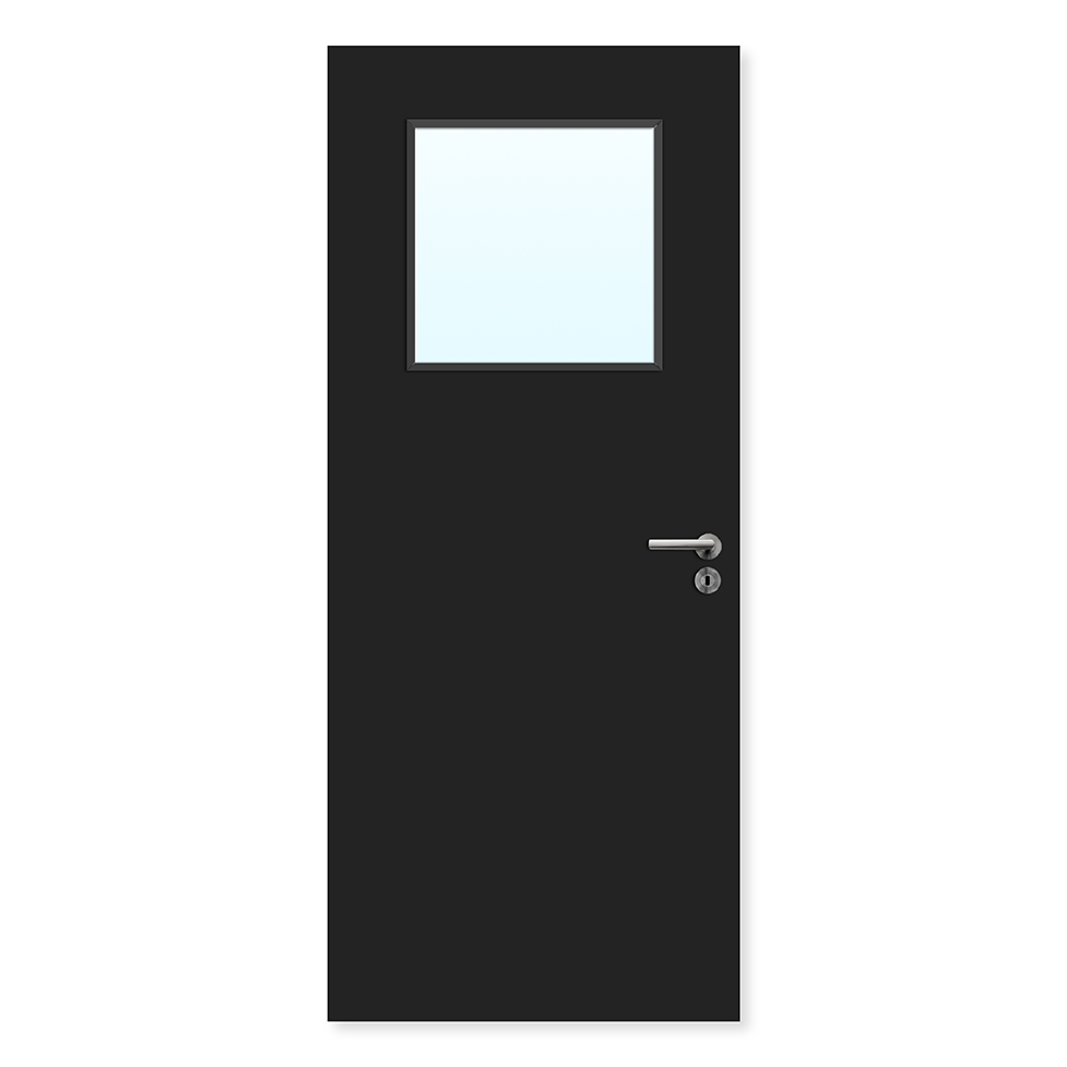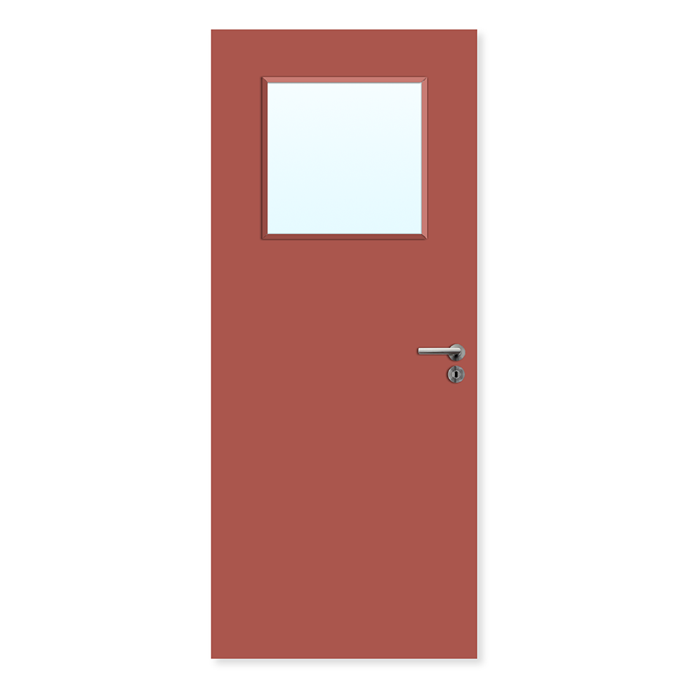 This single 30 minute fire door is glazed with a 450mm x 450mm glass panel.
