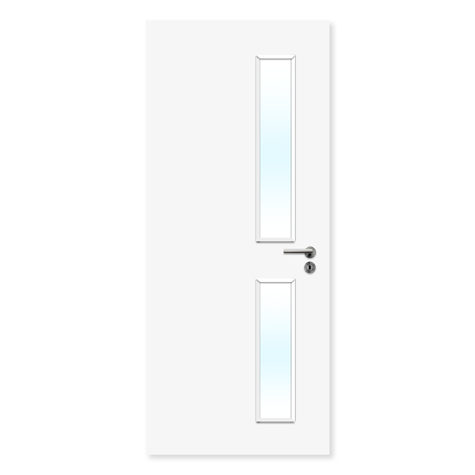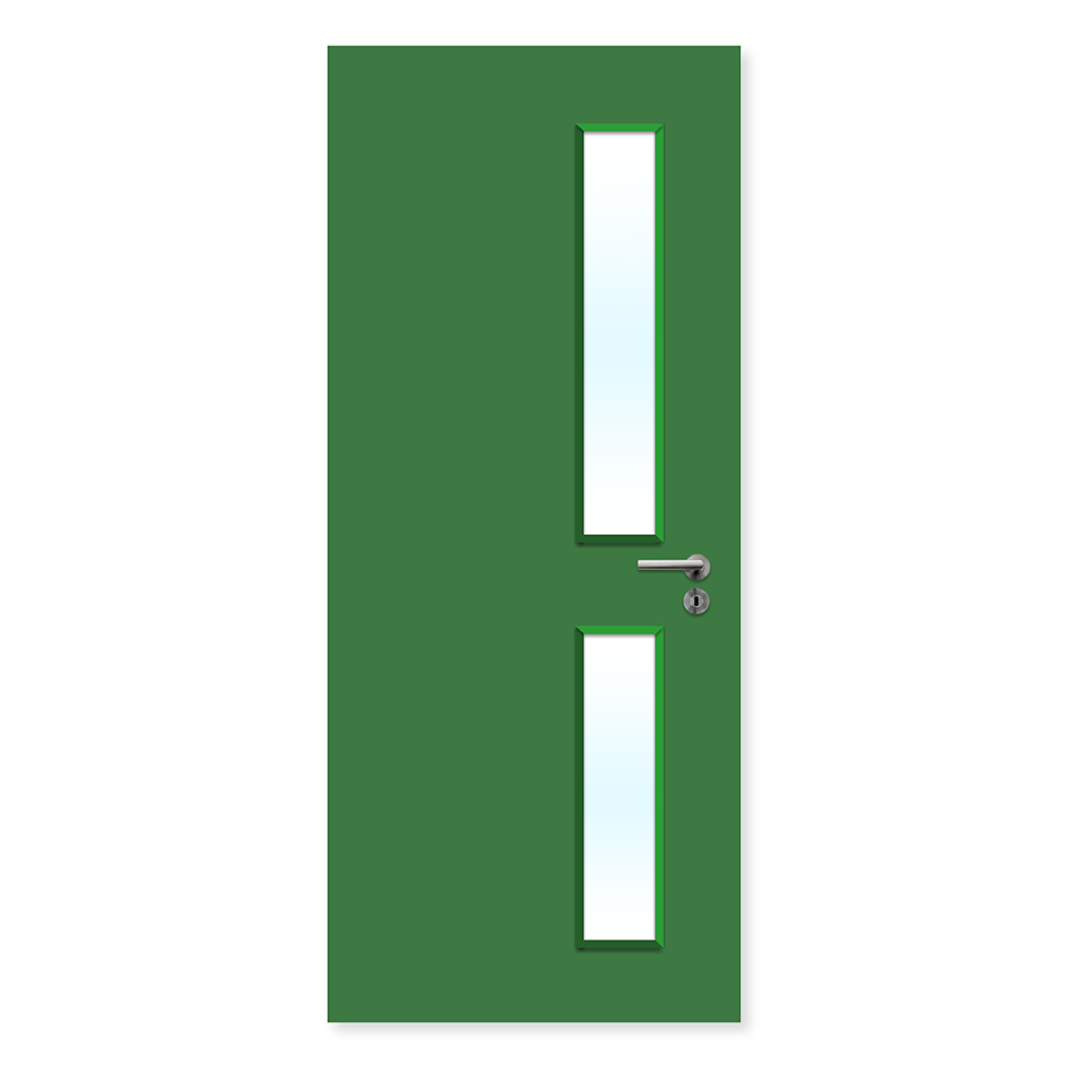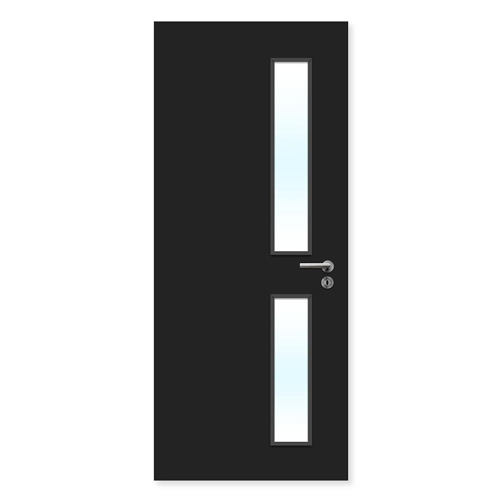 This single 30 minute fire door is glazed with 150mm x 775mm (top) and 150mm x 770mm (bottom) glass panels.