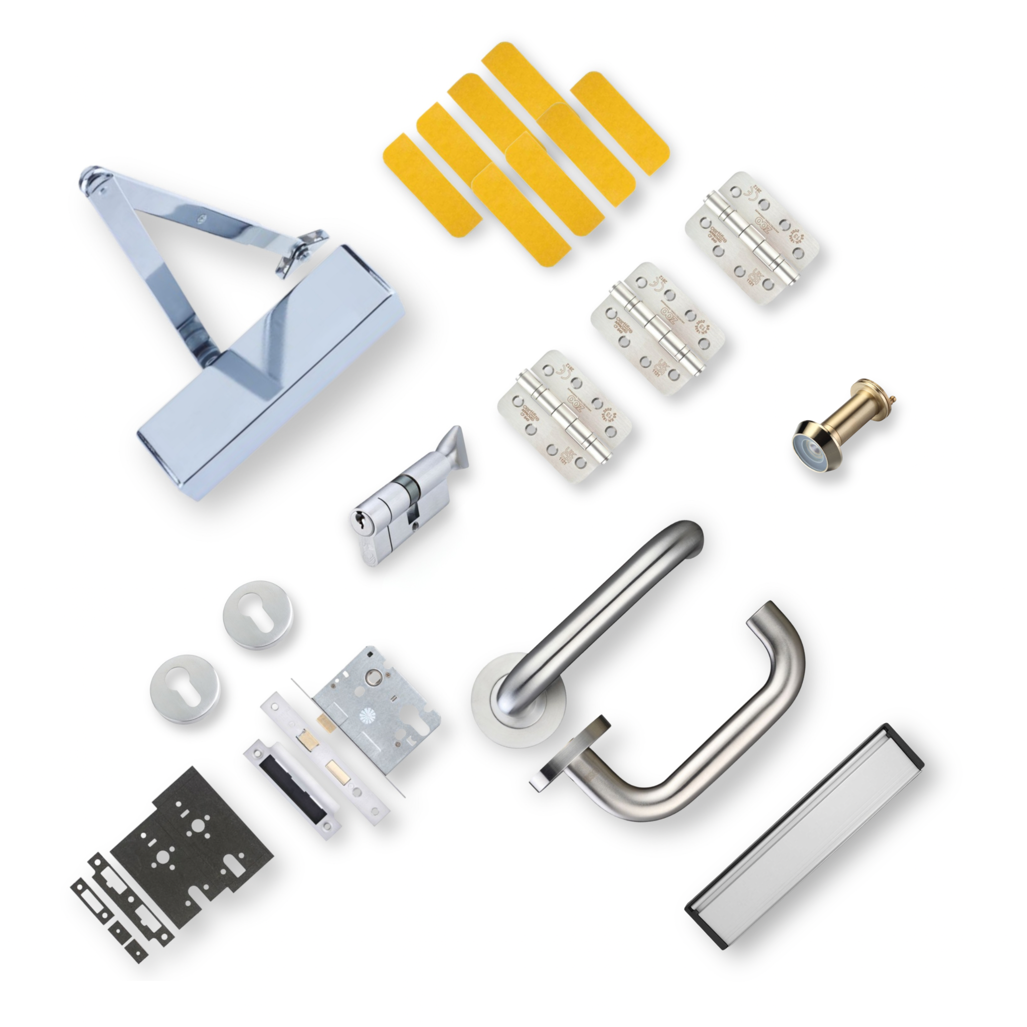 This complete Ironmongery Apartment Door Kit is designed to provide all essential components for fitting a secure and fire-rated single door in commercial or residential settings. Ideal for internal FD30 or FD60 timber doors, this set includes everything required for installation—right down to the intumescent pads.